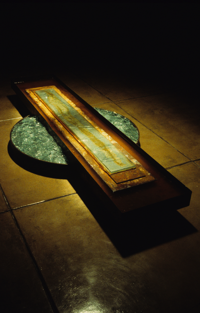 Joe Zuccarini Floating Dream 90X40X12 steel, glass, fabric, oils, water click for 300dpi